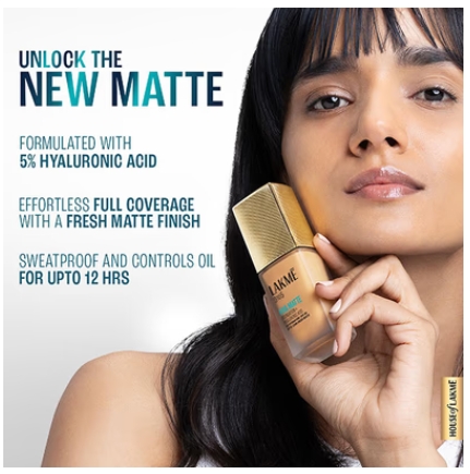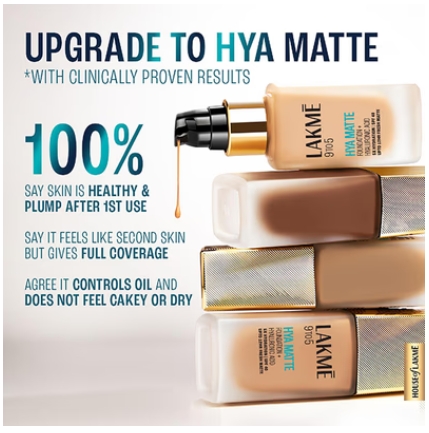 Flawless matte meets all day hydration. Introducing the new Lakme Hya Matte Foundation + Hyaluronic Acid, an innovative formula that delivers fresh matte complexion while hydrating skin from within. This unique formula, enriched with a 5% Hyaluronic Acid Complex and Hydra-flex Technology, provides intense hydration and keeps your skin nourished and supple all day long. This breathable, hydrating matte lasts upto 12 hours without feeling dry or cakey.