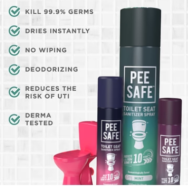 • The Toilet Seat Sanitizer protects you from germs and infections on the toilet seat and is your handy hygiene essential and one of the items you cannot leave home without. Lightweight bottle of the toilet seat sanitizer spray is the perfect companion while traveling. It kills germs, reduces the risk of Urinary Tract Infections and fits in the bag easily. The vivid mint fragrance makes your sanitation experience soothing. The fragrance even overpowers the distinguished odor of public urinals. The product is available in two sizes of 50ml ,75ml and 300ml.