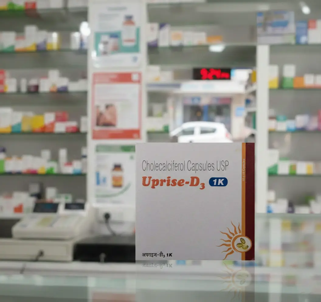 Uprise-D3 1K Capsule is a prescription nutritional supplement containing cholecalciferol (Vitamin D3) 1000 IU per capsule, used to prevent or treat Vitamin D deficiency and support overall health, particularly bone density.