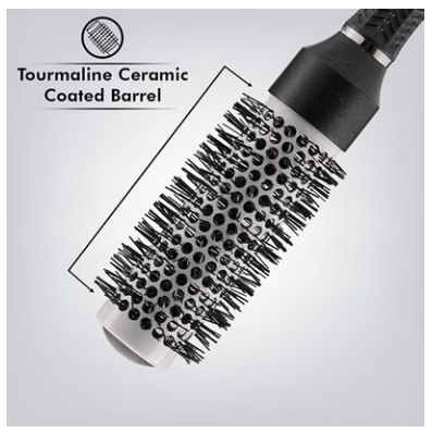 is a professional-grade styling tool featuring a tourmaline ceramic-coated barrel and heat-resistant ionic bristles to reduce frizz, enhance shine, and allow for faster blow-drying. It is available in various barrel sizes to suit different hair lengths and desired styles.